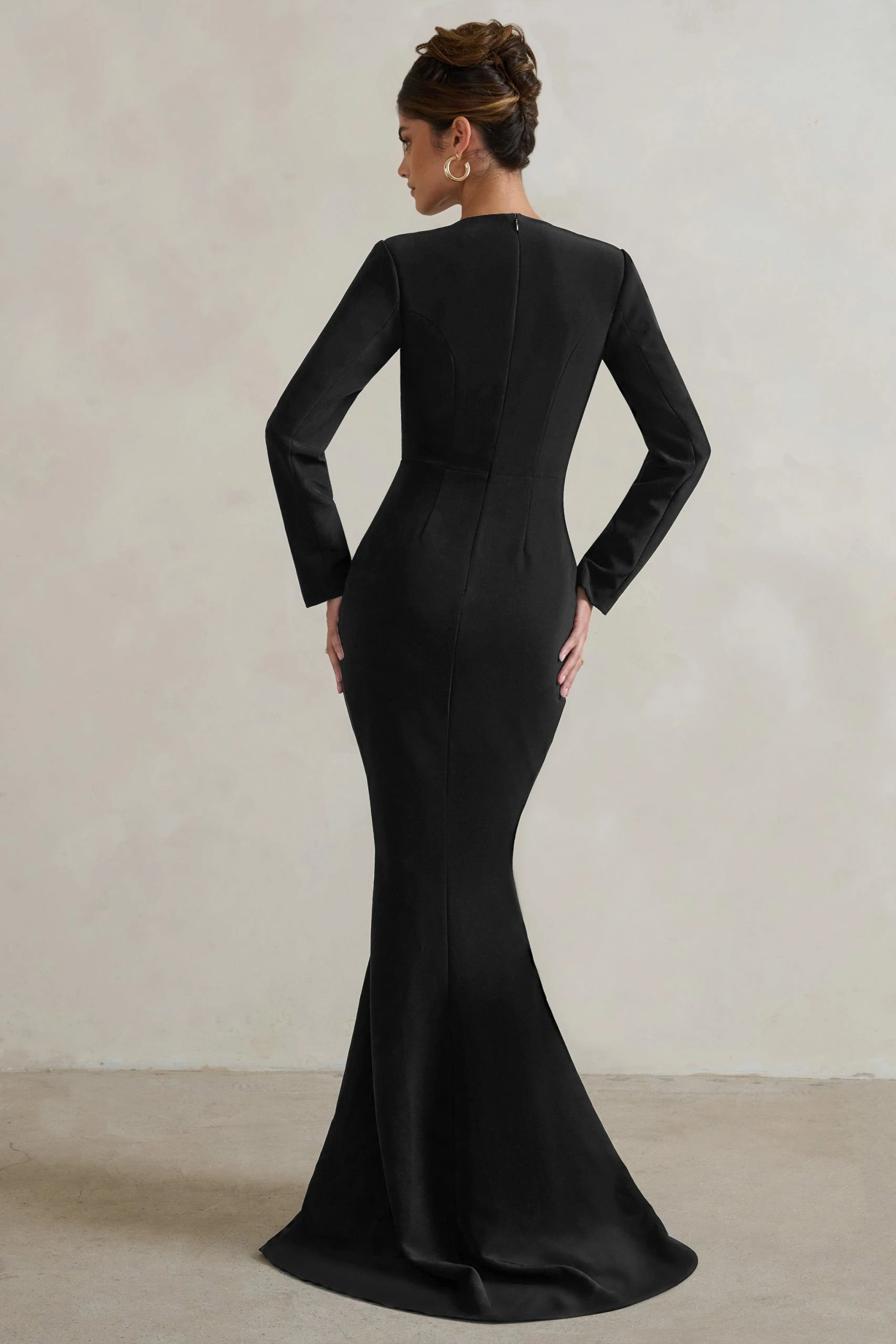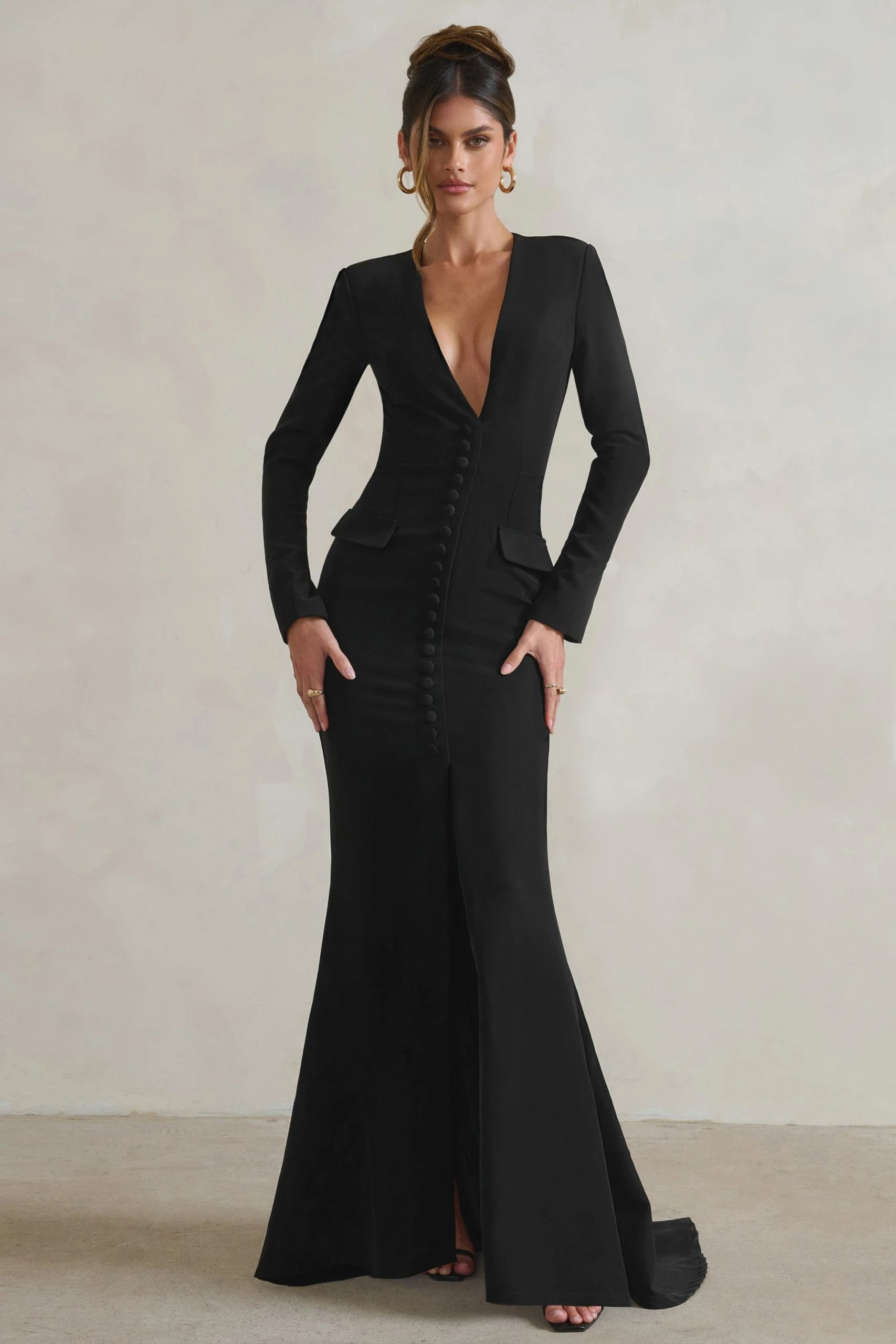 Get ready to stand out wherever you’re next invited in this tailored maxi dress made from smooth black crepe. Characterized by a plunging neckline and closed by covered buttons, Reba is made all the more eye-catching by long sleeves with padded shoulders and a split fishtail skirt.