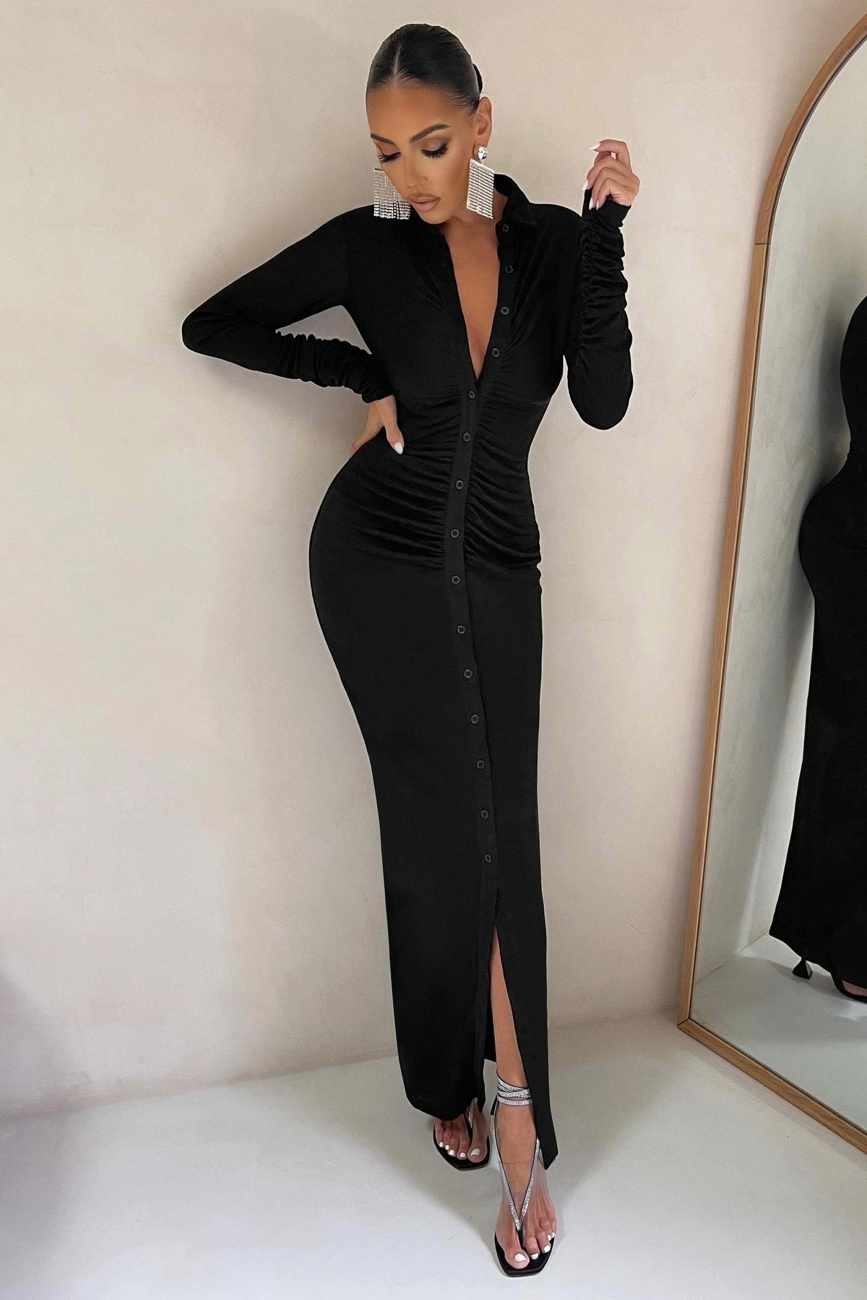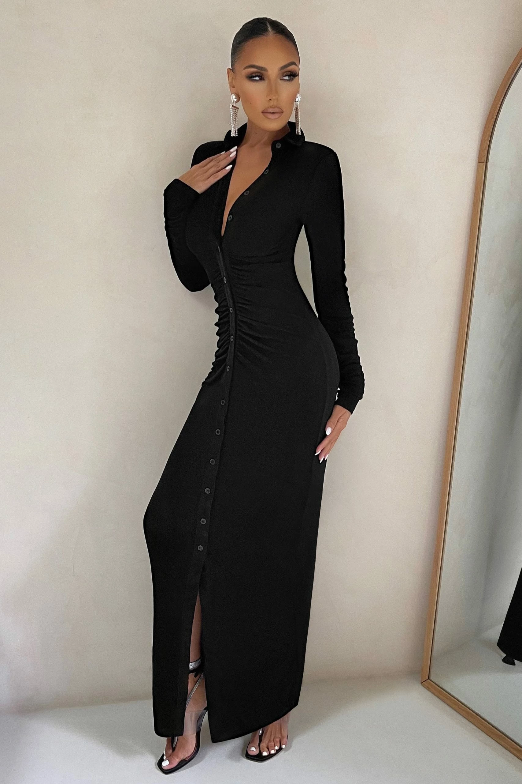 Talk about the epitome of casual glam! Our black “Restless Heart” maxi dress takes the effortless chic and glamour combo to high levels. Cut from our signature stretch-jersey, it fits you like a glove and contours your curves in all the right places. The detailed ruching highlights all your best assets, while the long sleeves add extra warmth on these cold party nights. In a gorgeous sophisticated black hue that is timeless for all seasons, this stunning long-sleeve dress has the extra edge. The button-up front allows you to switch between a modest look and something a little more sultry… Pure sophistication!