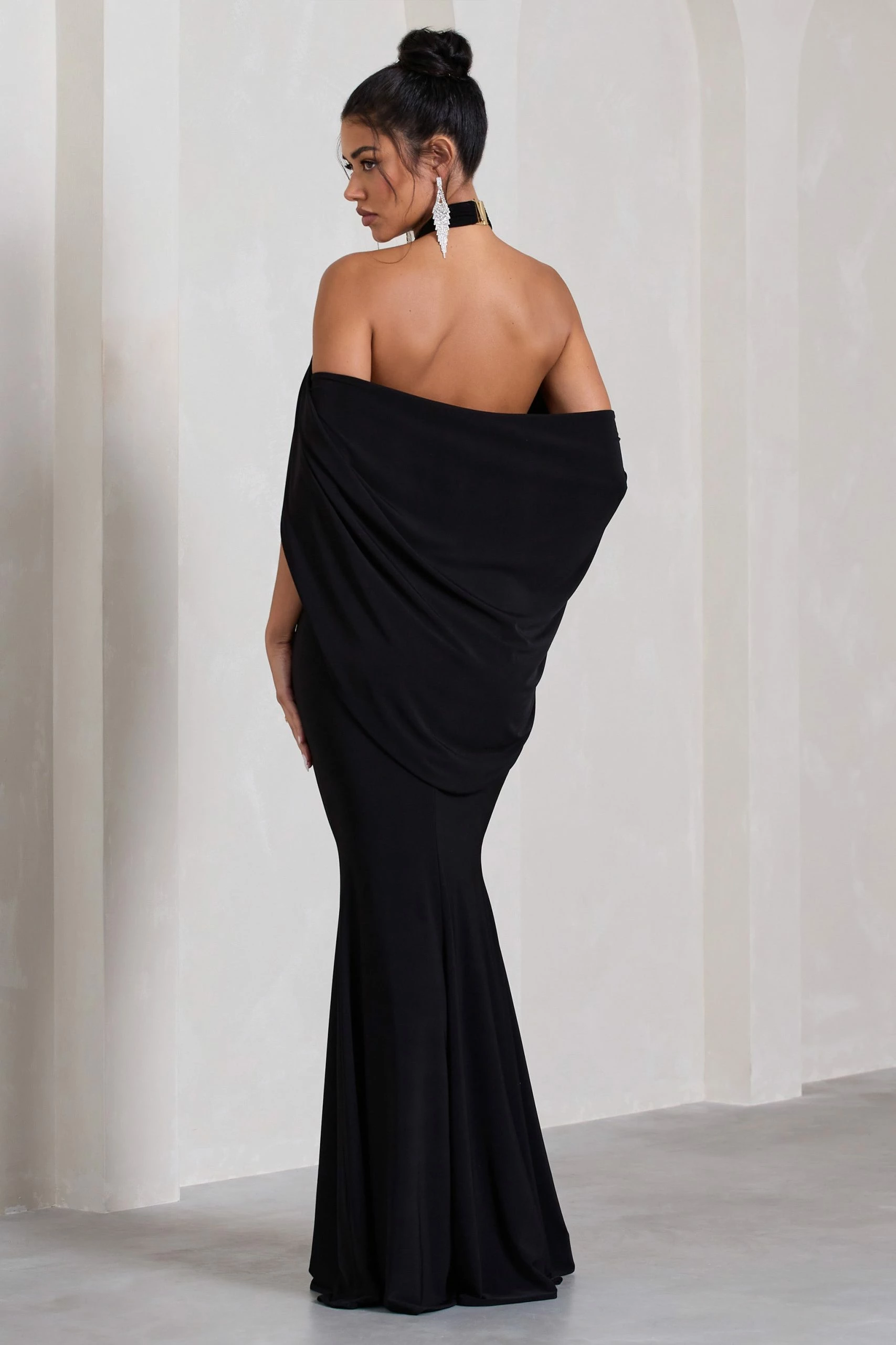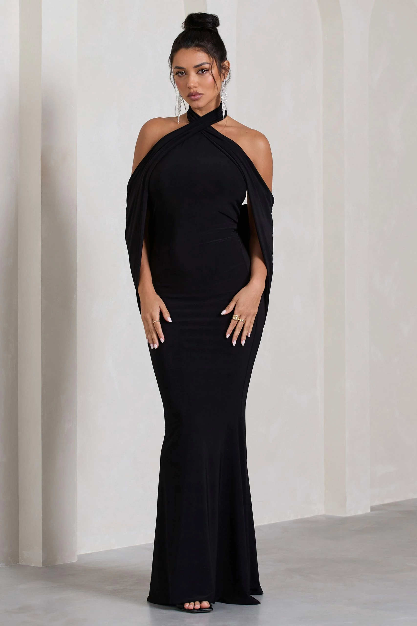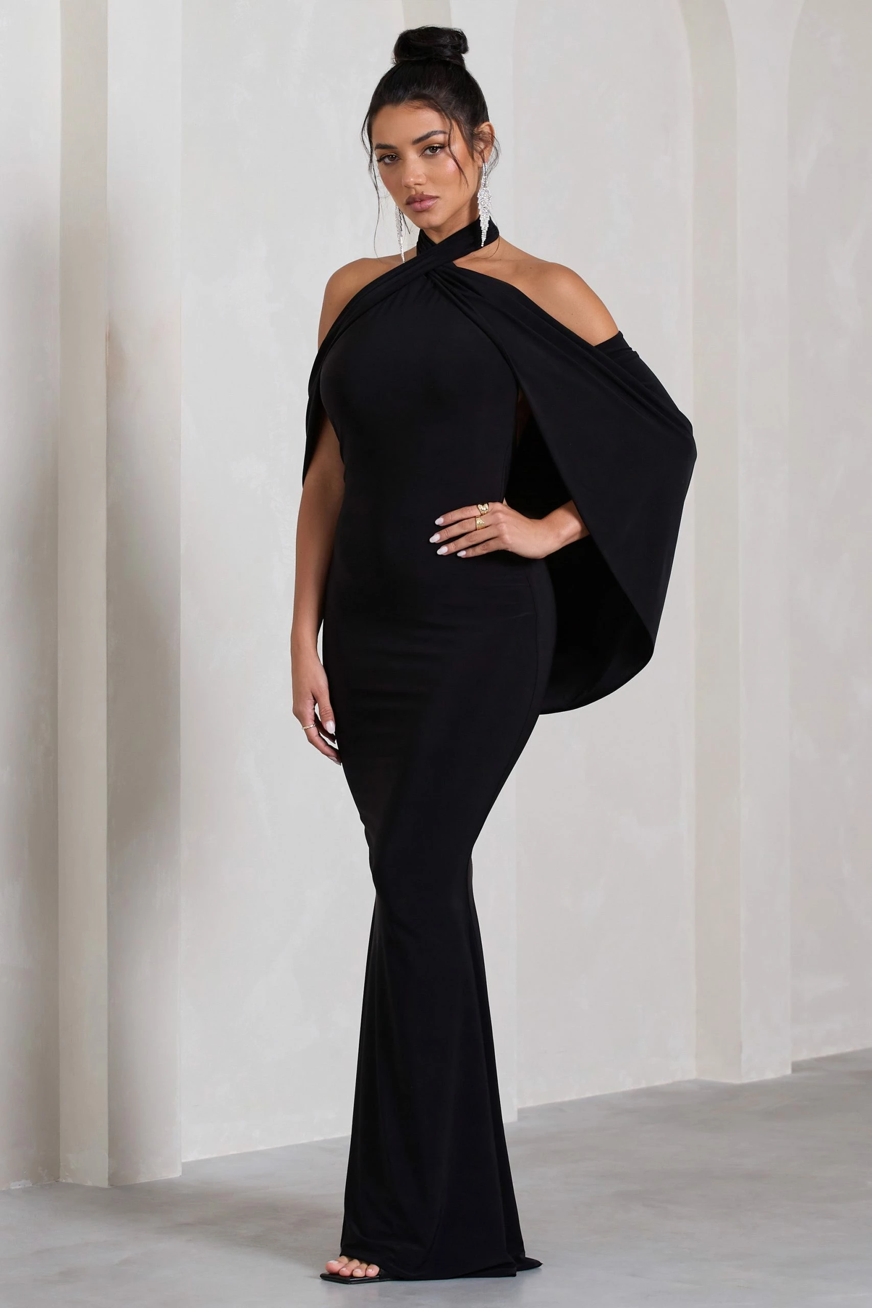 With multiple elevated details that bring the drama, Revelation is the perfect option for your next black tie event. Featuring an elegant crossed halter-neck, this black maxi dress is characterised by its open-back which flows into a captivating cape detail.Â