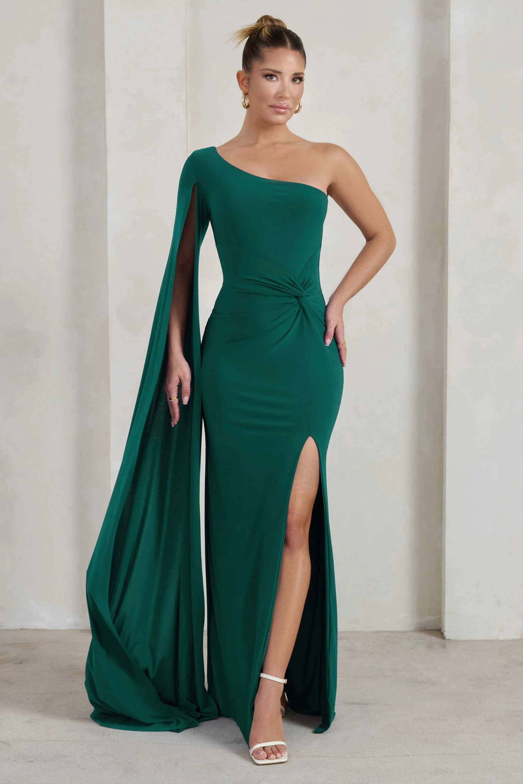 Be the most memorable attendee at your next black tie or birthday soiree wearing our asymmetric maxi dress also known as Romi. Incredibly stretchy with intense colour, this green floor sweeper features a single cape sleeve that drapes past a twisted knot designed to accentuate your waistline. Finished with a striking split, Romi is made for maximum impact.