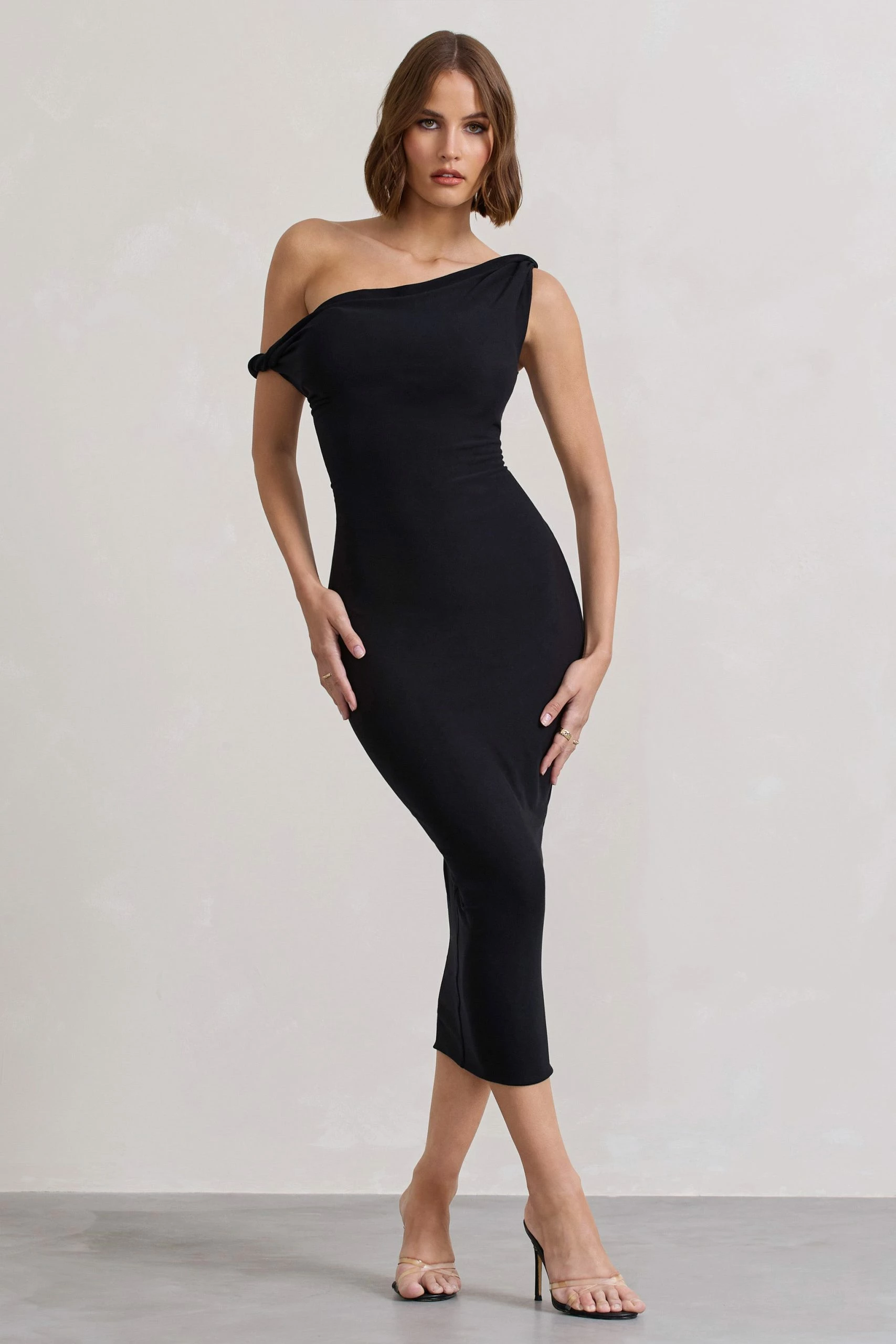 Minimalistic with a twist, say hello to Salome. This midi dress in black has been crafted in our premium brushed jersey for figure-flattering comfort. Detailed with an asymmetric twisted neckline for a new season shape, keep Salome at the forefront with a sleek updo and gold accents.