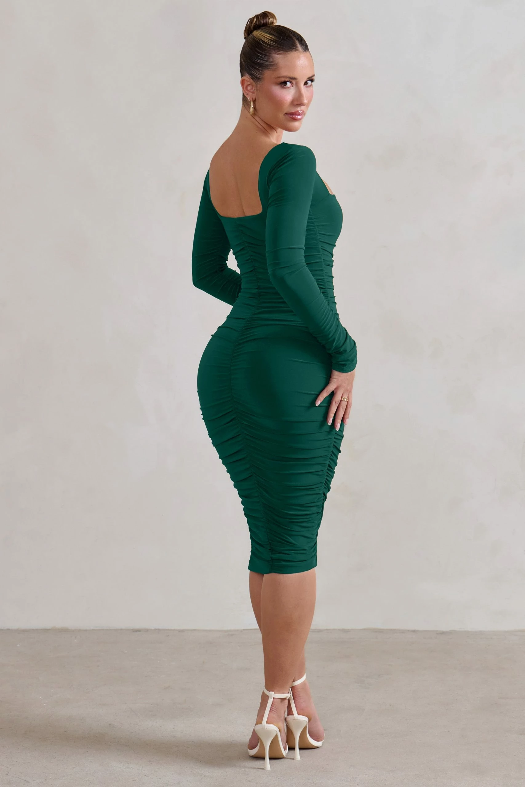 Carefully crafted in a premium stretch jersey, this form-flattering midi is a must-have for any formal wardrobe.ย Seductressย arrives in a rich bottle green shade and boasts a supportive square neckline, full body ruching and a sculpting bodycon silhouette. For a sophisticated dinner date ensemble, try pairing this alluring midi with a sleek bun and statement earrings.