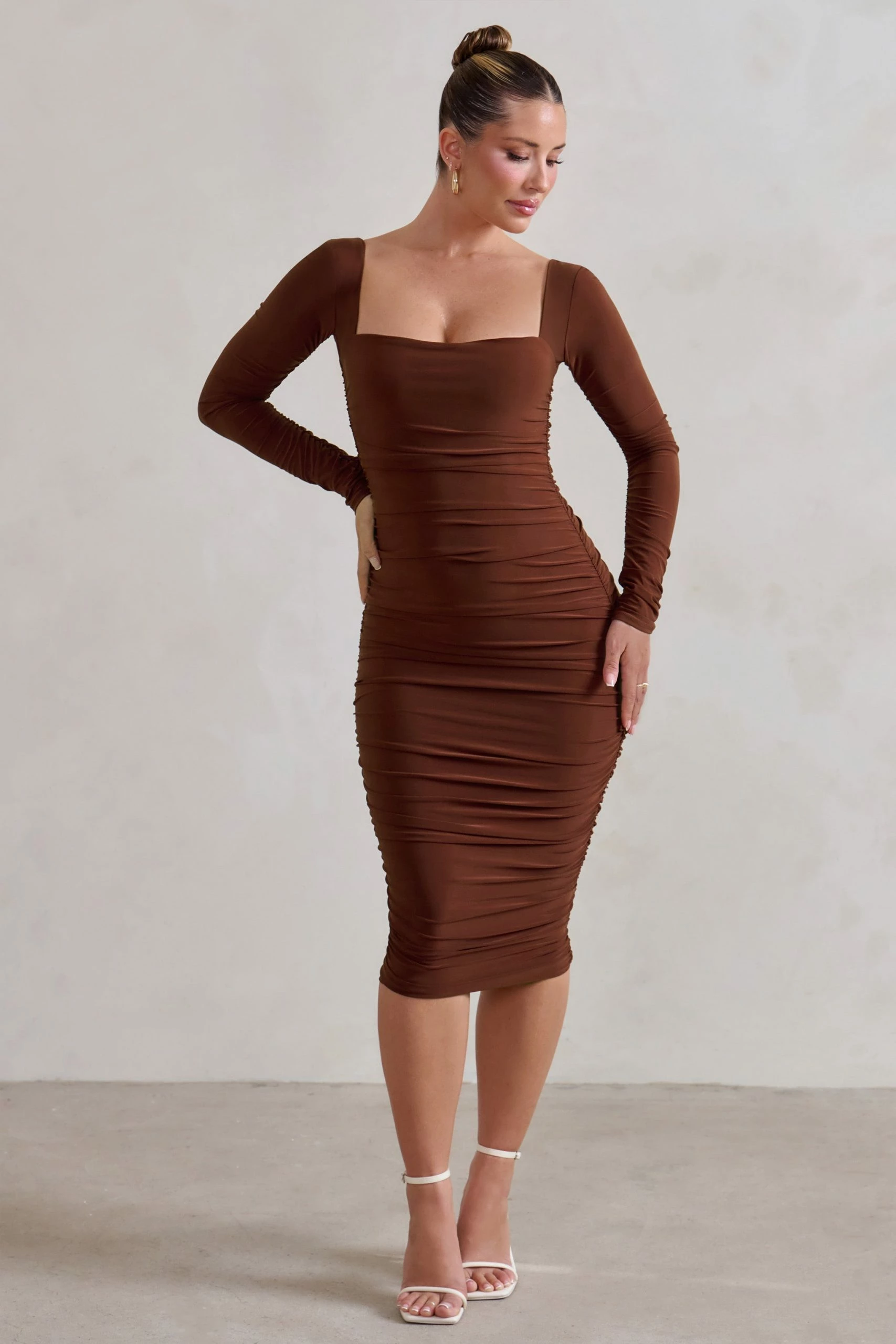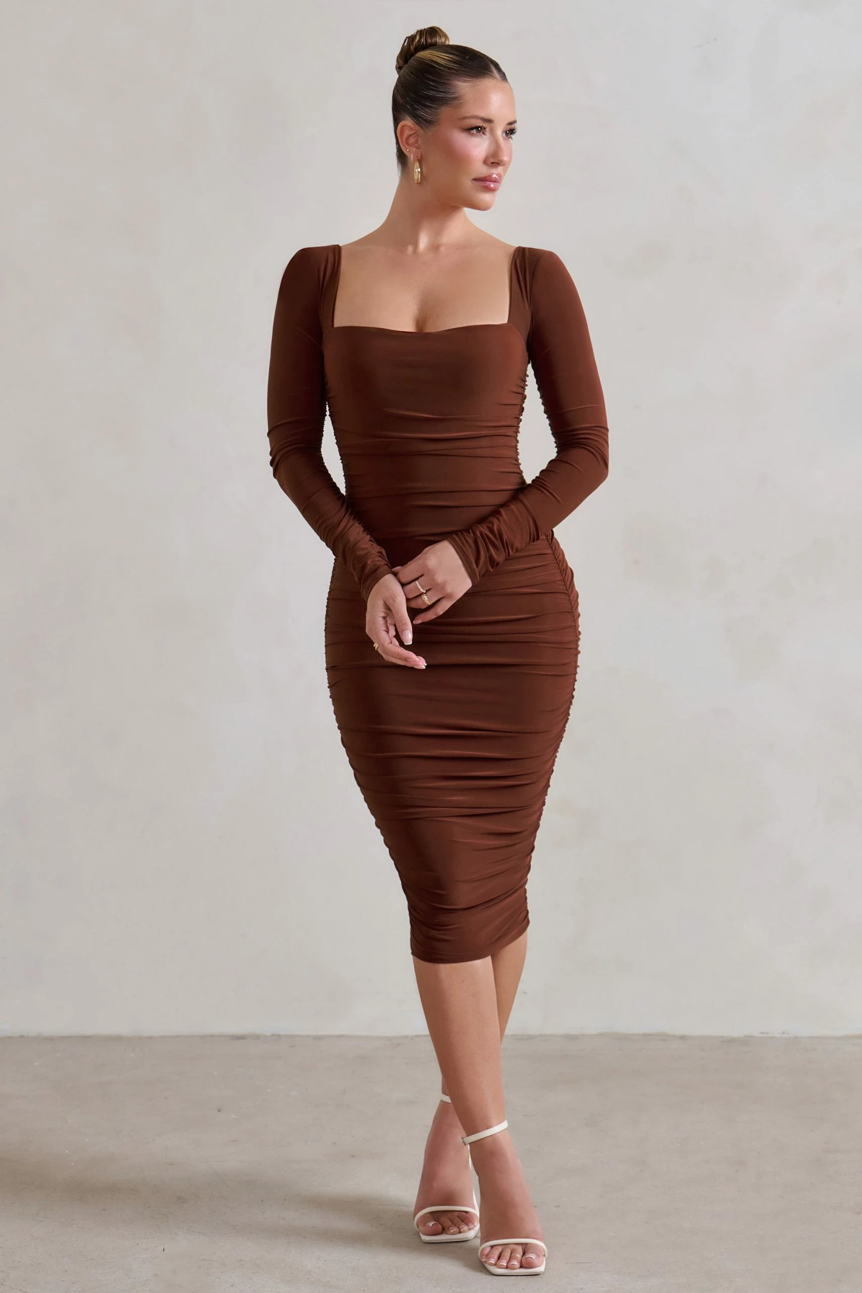 Carefully crafted in a premium stretch jersey, this form-flattering midi is a must-have for any formal wardrobe.ย Seductressย arrives in a rich chocolate brown shade and boasts a supportive square neckline, full body ruching and a sculpting bodycon silhouette. For a sophisticated dinner date ensemble, try pairing this alluring midi with a sleek bun and statement earrings.