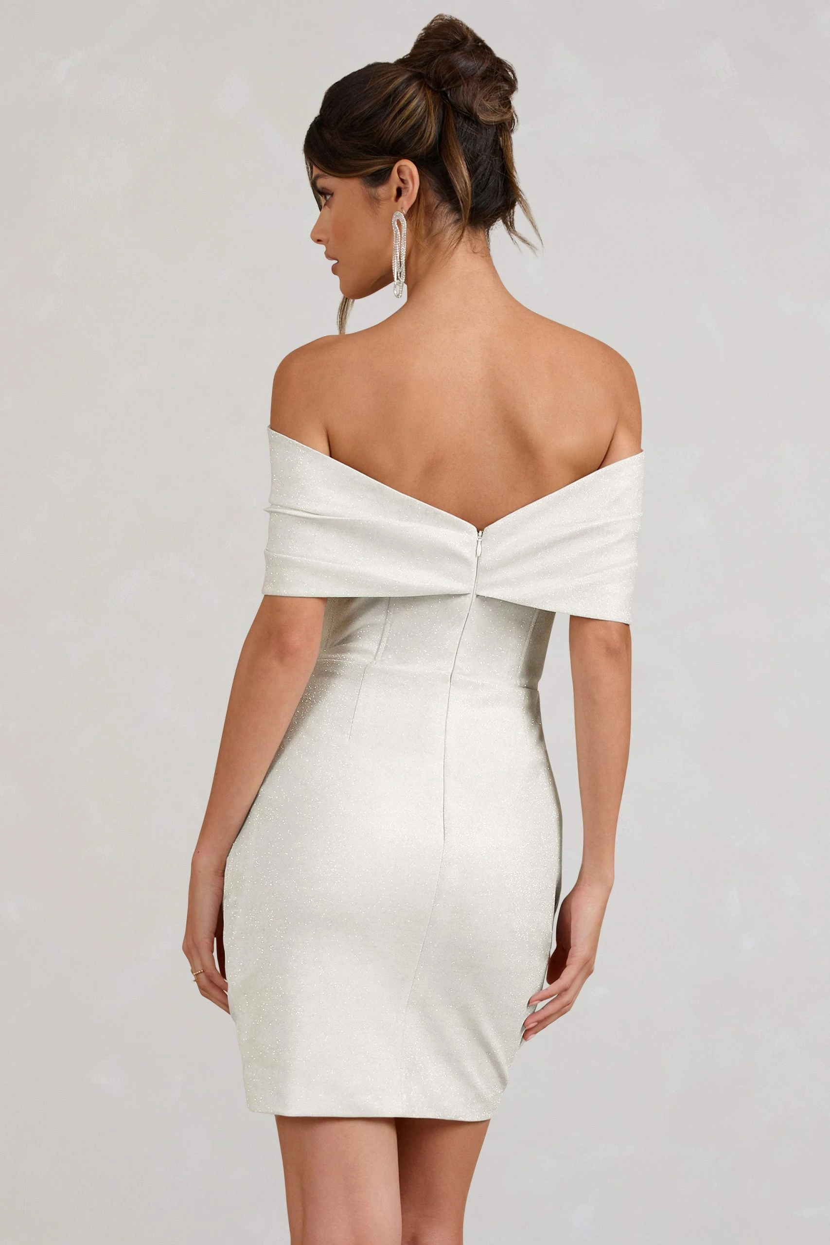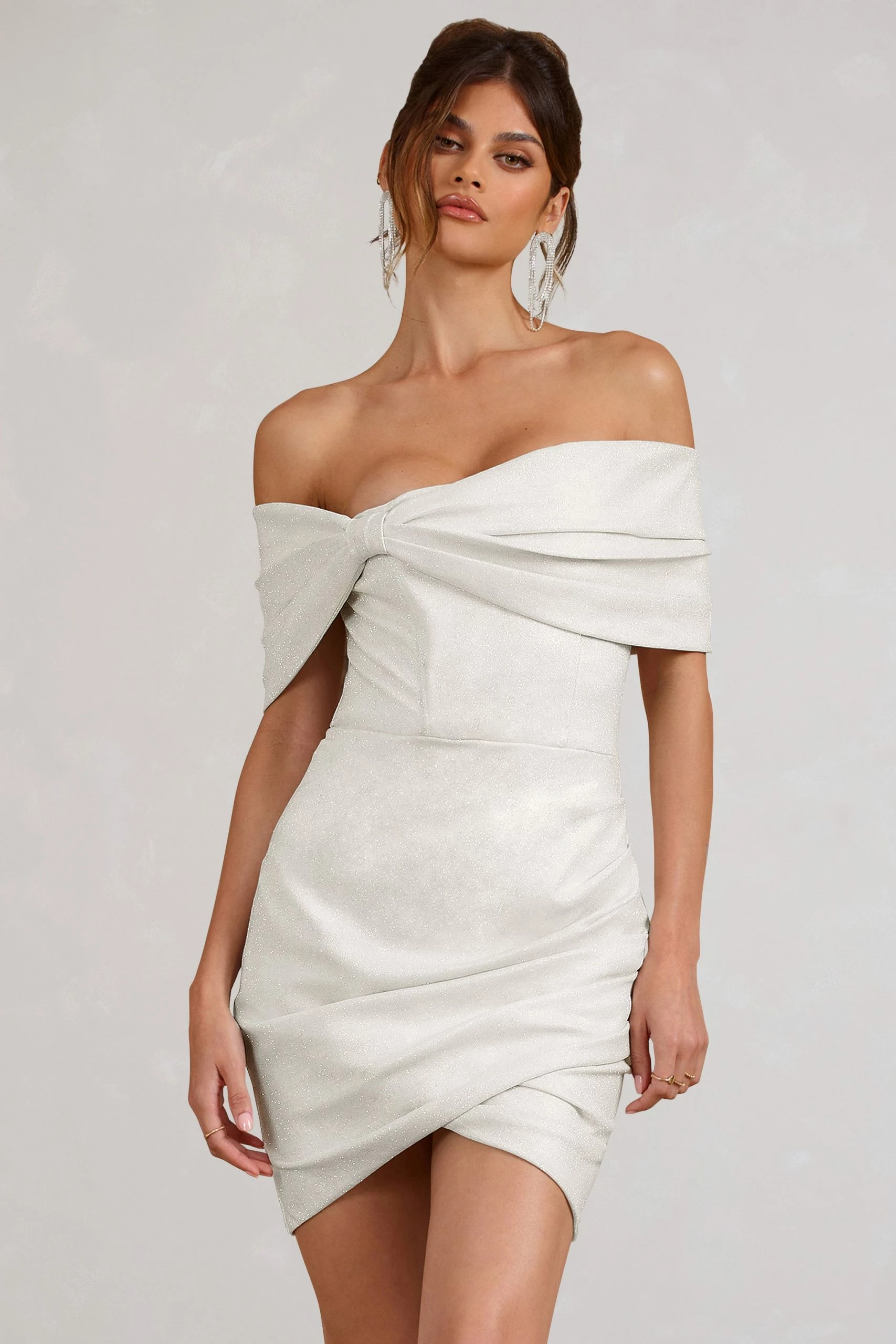 Glisten under the evening lights in our stunning Snowdrop mini dress. Designed in luxurious glittered lurex, this silvery white dress features a Bardot neckline wrapped by an oversized bow, sculpting waist seams and a fitted wrap skirt. Why not complement Snowdrop’s sparkle with a few diamond-encrusted accents?