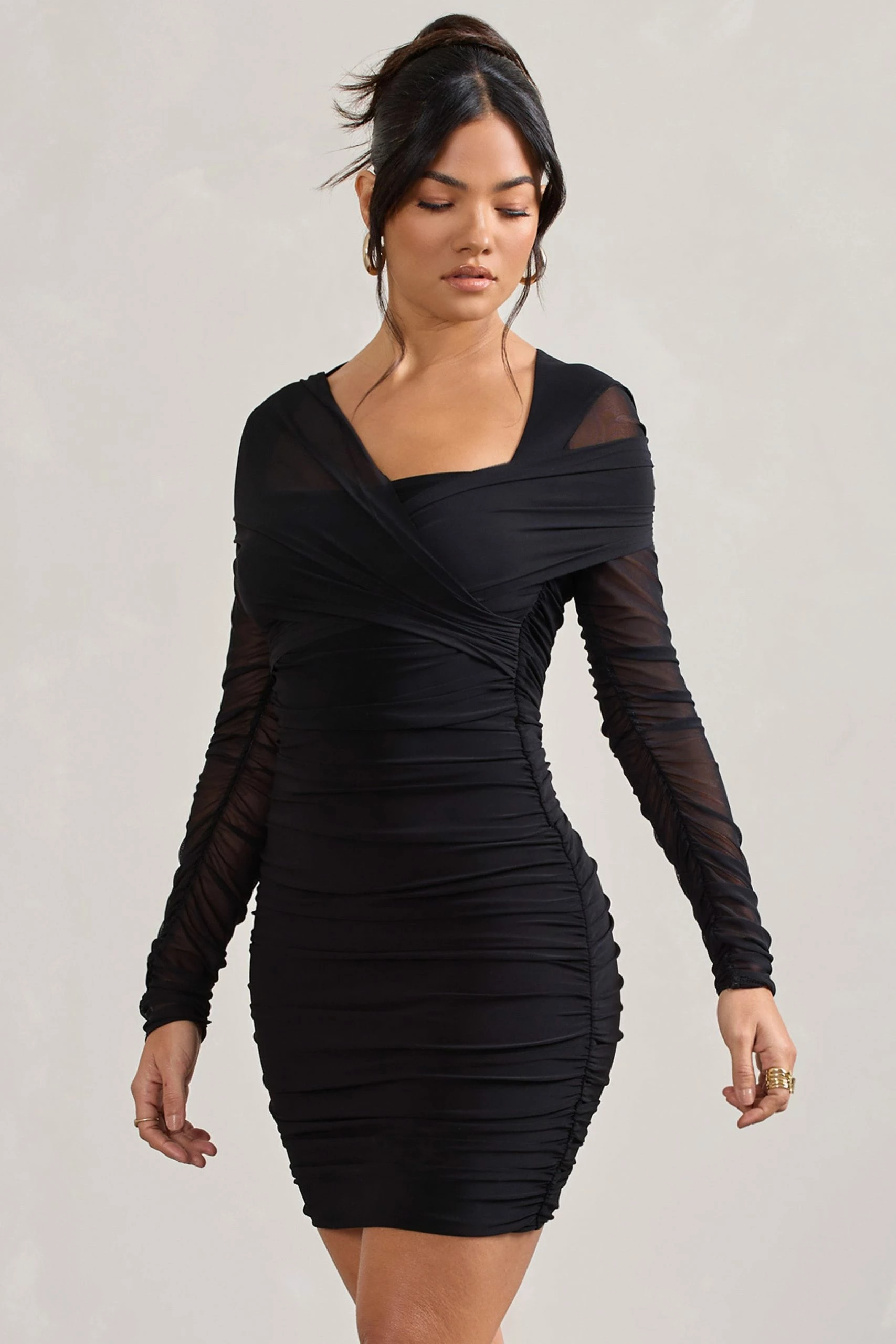 Daiquiri | Black Ruched Cut Out Mesh Mini Dress With Long Sleeves