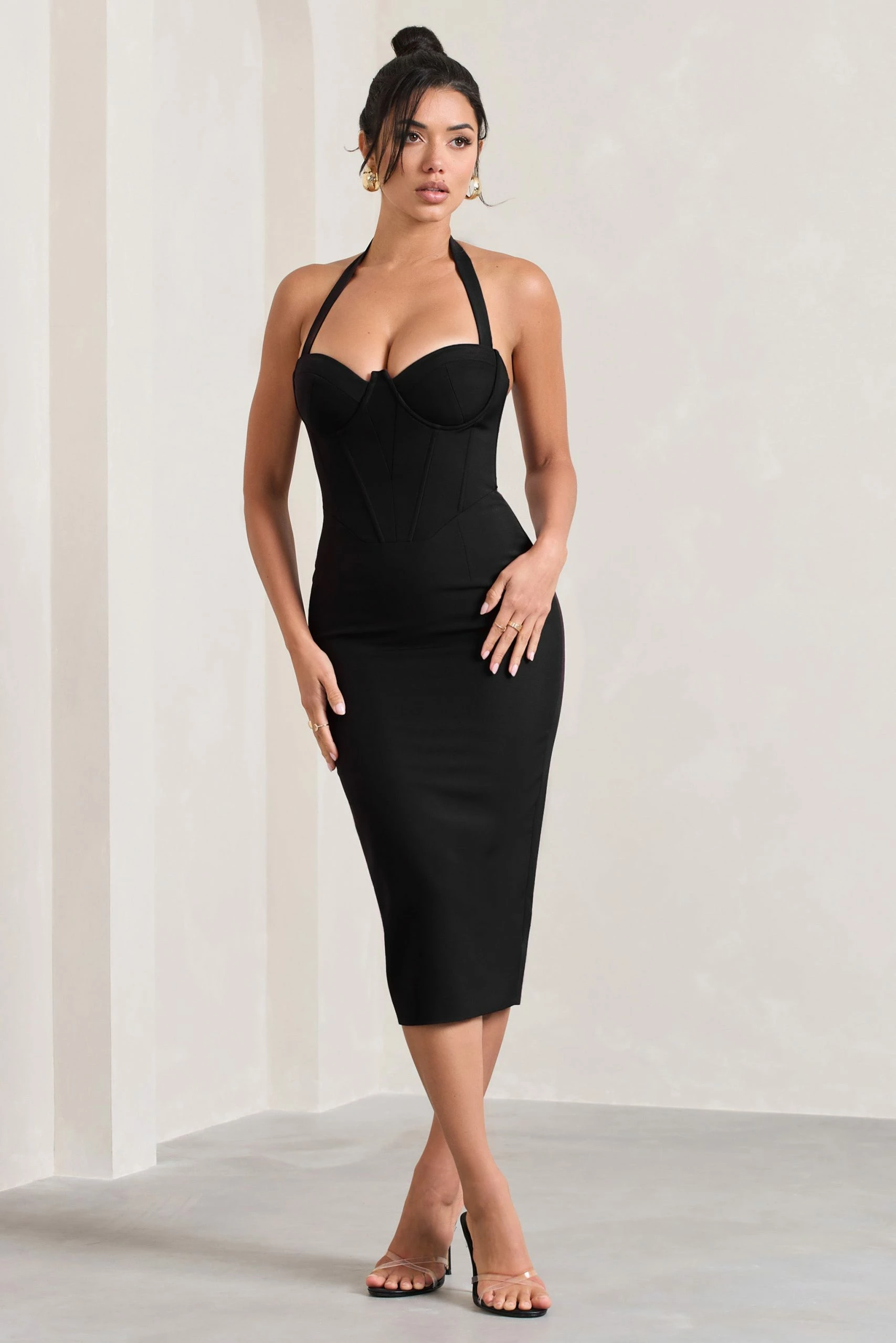 Feel like a supermodel in this aptly-named black midi dress. Sculpting your figure in a premium stretch crepe, Supermodel is defined by a structured corset that carries into a classic halter neckline. Style this exquisite dress with a pair of strappy stilettos for the perfect party-ready look.