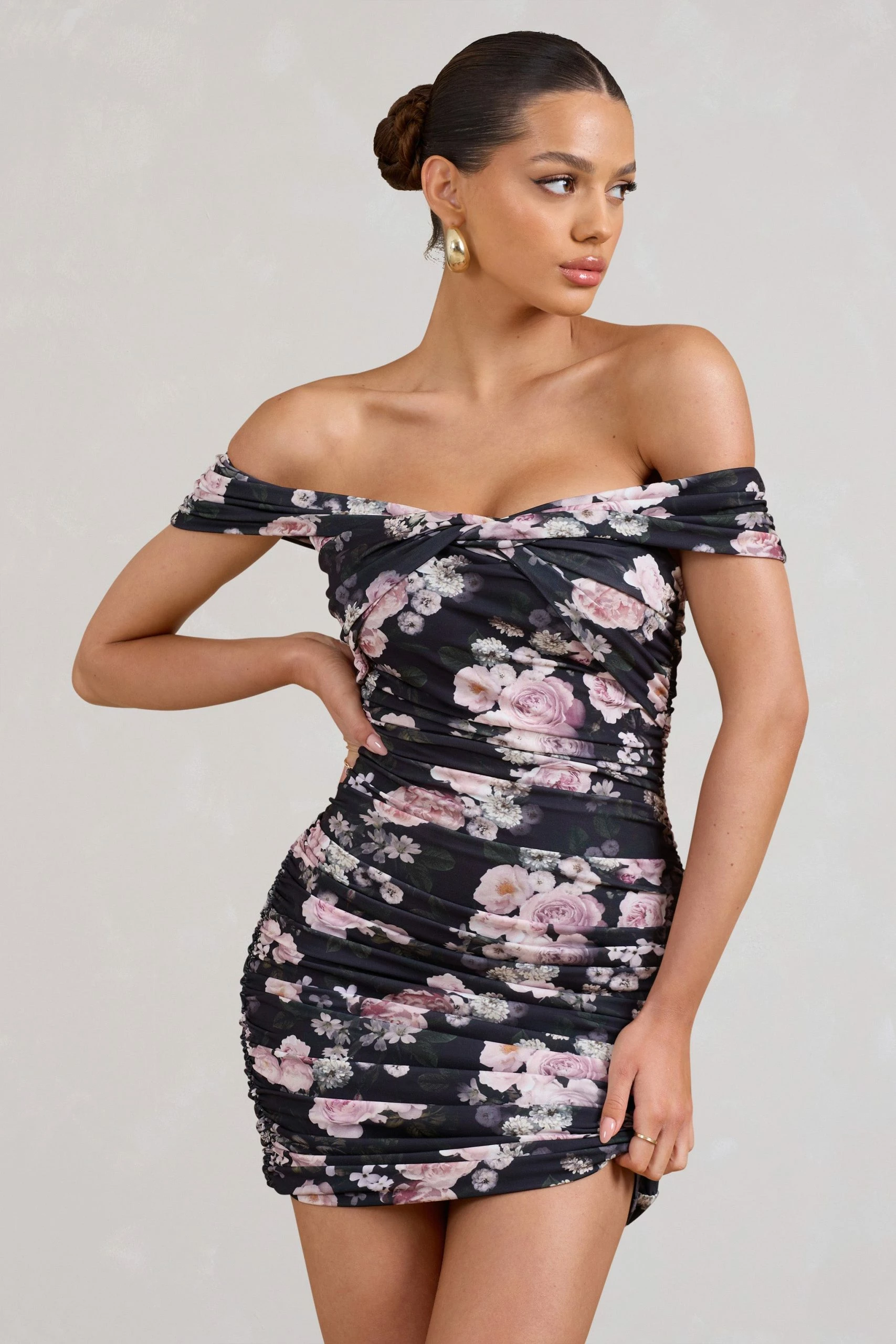 Despite this dress’ sharp name, it prefers to softly sculpt your figure in a fully-ruched black floral jersey. Thorn is defined by a twisted Bardot neckline and a flattering bodycon fit. Pair this floral mini dress with small gold hoops for an effortless invite-ready outfit.