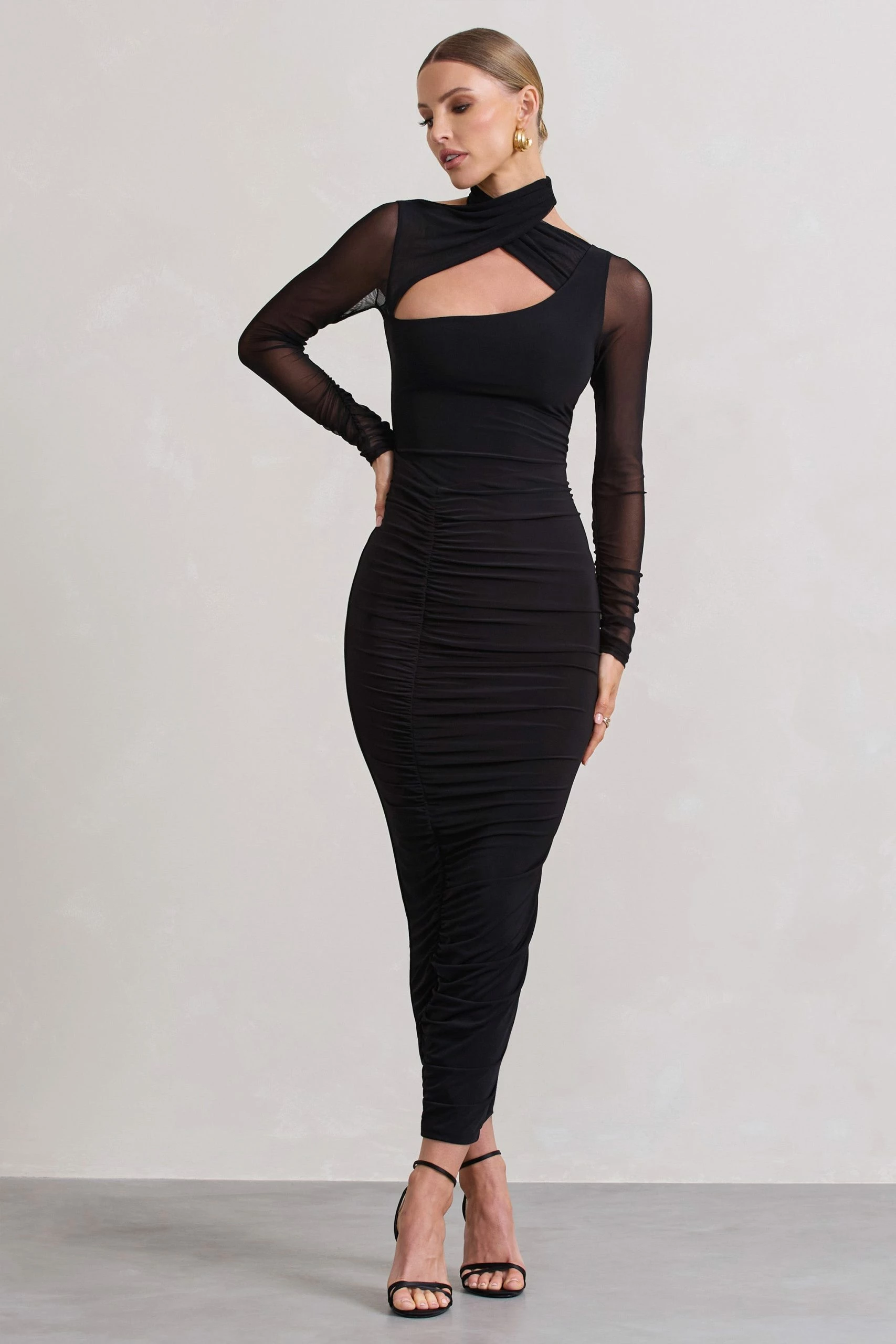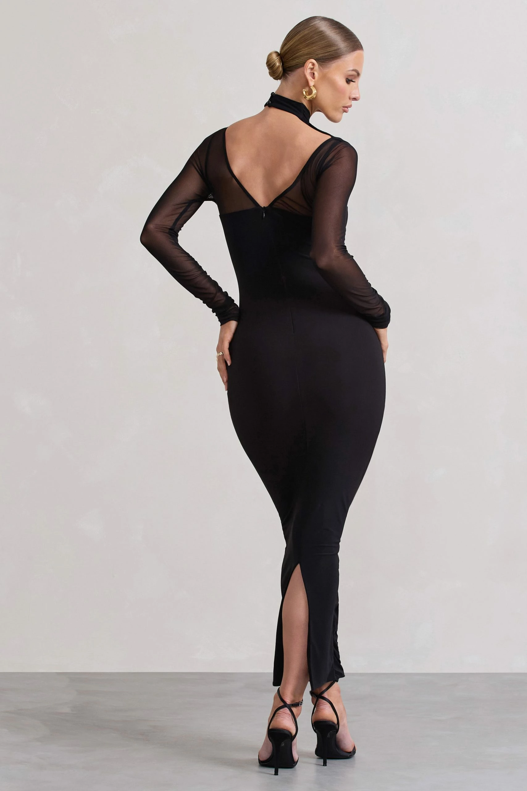 With multiple elevated details that bring the drama, Under Wraps is a perfect addition to any wardrobe this season. Arriving in a curve-hugging bodycon silhouette, this black midi dress is defined by a delicate mesh halter-neck and long sheer sleeves. For an elevated look, try styling yours with some strappy heels like Rotation.Â