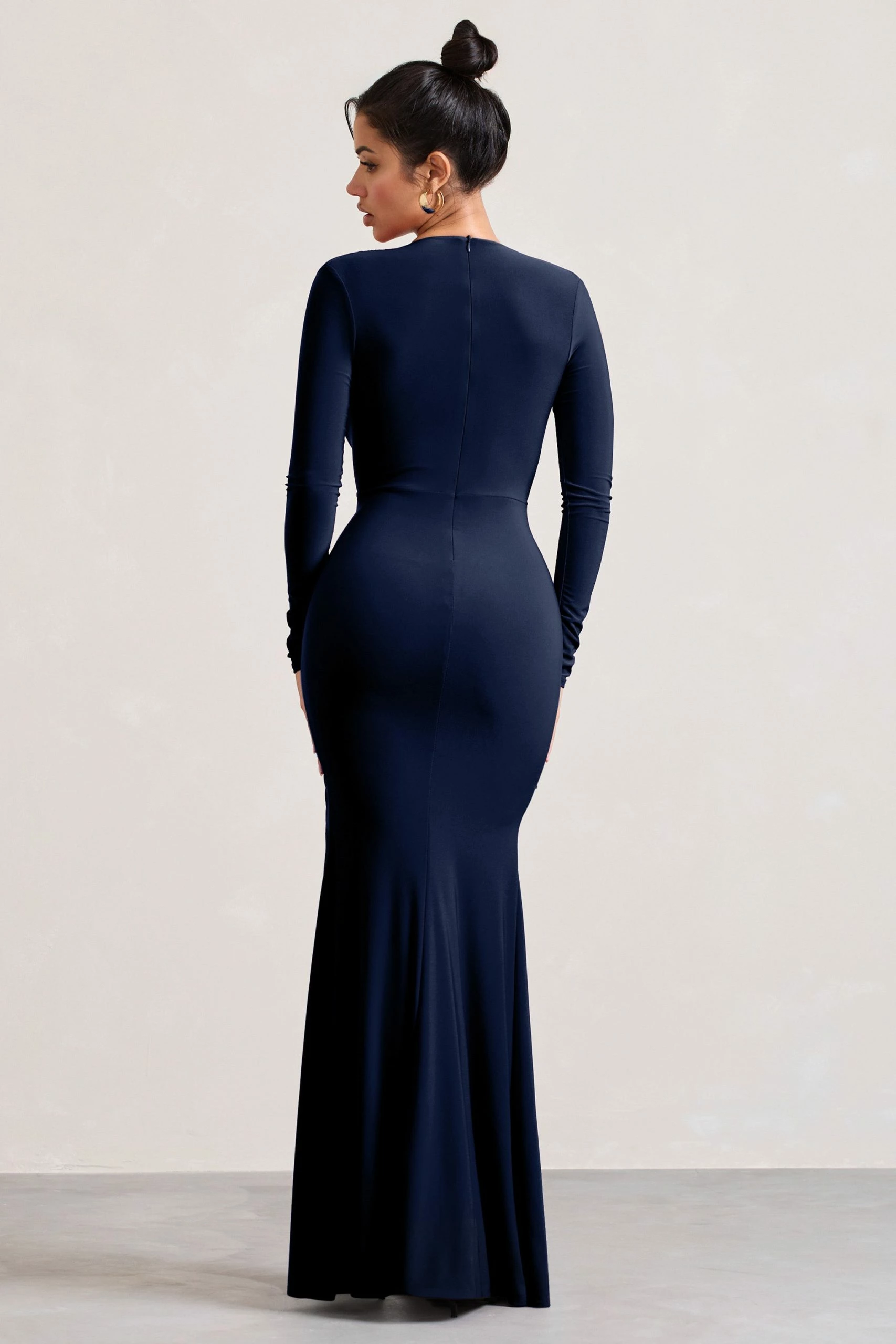 Prepare to grab the limelight in our “Unforgotten” navy maxi dress. This sophisticated evening gown is fully ruched and cut in a gorgeous jersey fabric to contour and sculpt your silhouette. With a wrap front v neckline that flatters your bust, floor-sweeping hemline, and thigh-split which flirts just the right amount of skin. Leave them wanting more in this stunning maxi.