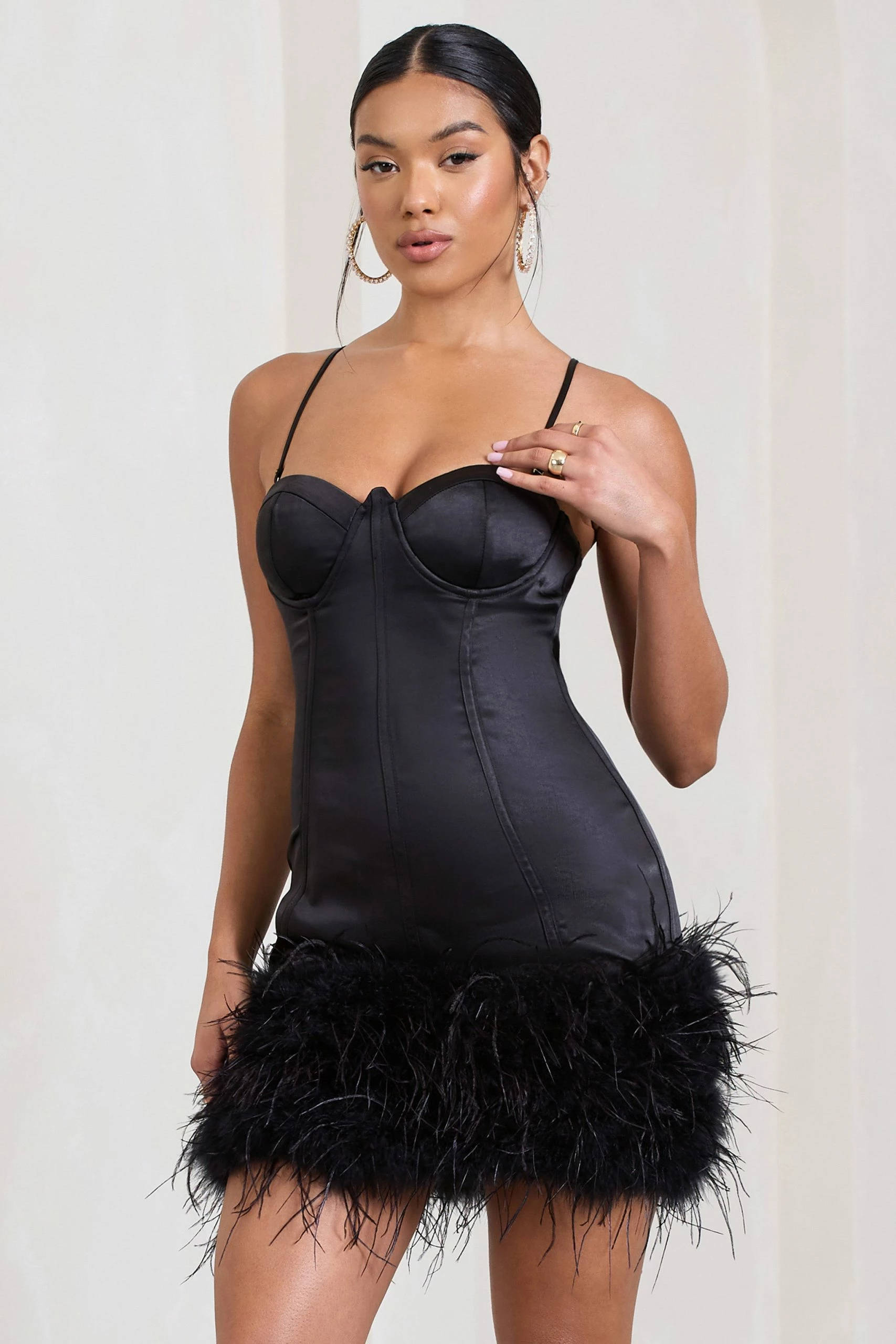 Our latest eye-catching mini Vampira is the perfect dress for your next birthday soiree. Showcasing a luxurious feather trim, this structured piece features a boned bodice to enhance your feminine figure in all the right areas. Its detachable straps add a touch of versatility to this LBD.