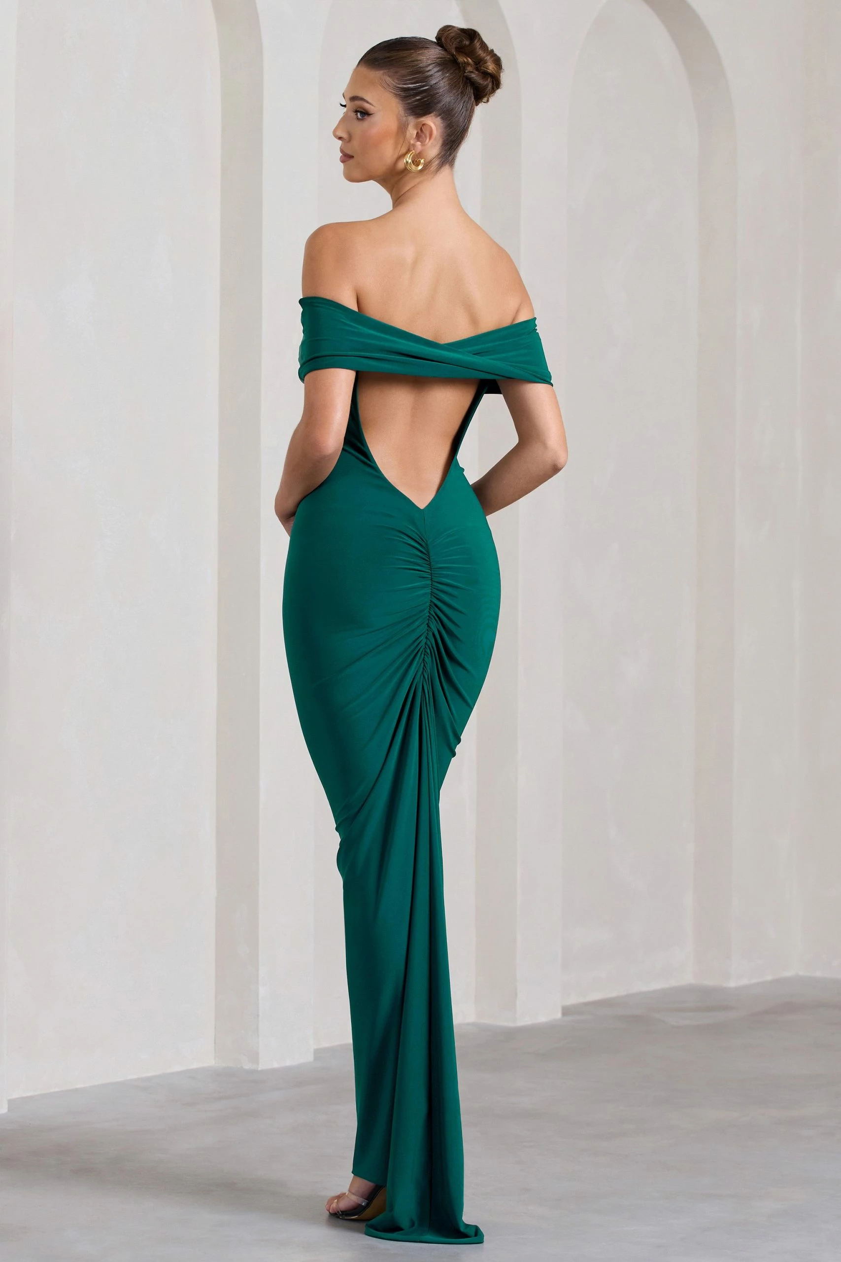 Sitting elegantly off the shoulders, our Vivienne maxi dress is the epitome of understated glamour. Arriving in a rich bottle green shade, Vivienne is defined by a contemporary open-back detail highlighted by flattering ruching. Completed with a godet-inspired train, try styling this maxi with some strappy stilettos for the perfect wedding guest look.